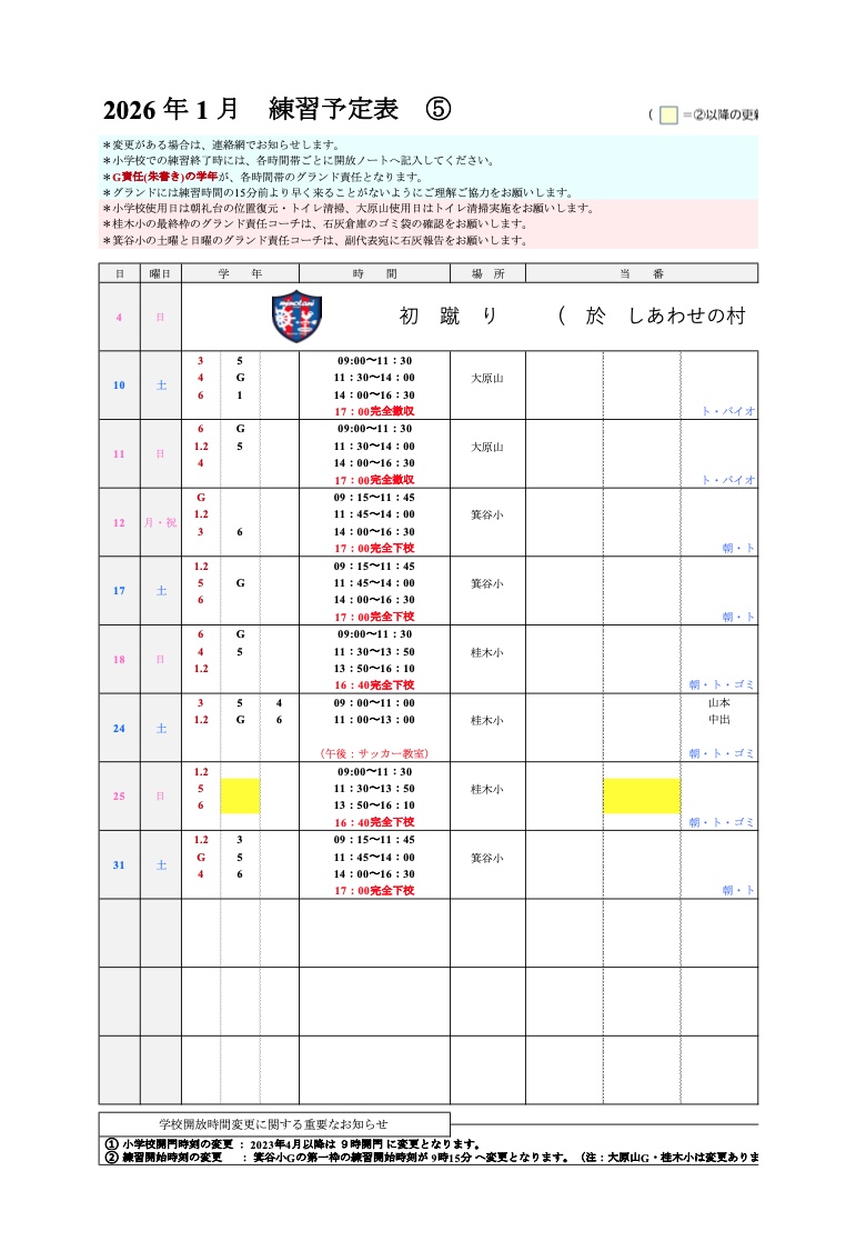 ※試合等で日程が変更になる場合があります。※変更等がある場合は、連絡網を正として下さい。